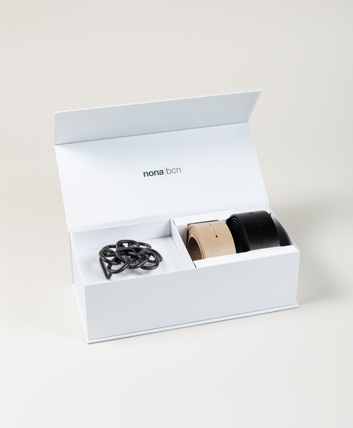 Pack format per una sivella joia model Nus Nero i dues corretges de pell de gran qualitat intercanviables, colors a escollir. Amb el nostre sistema exclusiu de tancament podràs canviar la corretja de manera fàcil i còmoda segons et convingui.