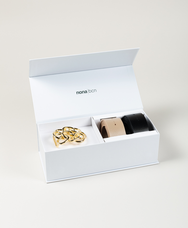 Pack format per una sivella joia model Nus Oro i dues corretges de pell de gran qualitat intercanviables, colors a escollir. Amb el nostre sistema exclusiu de tancament podràs canviar la corretja de manera fàcil i còmoda segons et convingui.