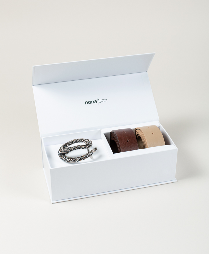 Pack format per una sivella joia model Snake i dues corretges de pell de gran qualitat intercanviables, colors a triar. Amb el nostre sistema exclusiu de tancament podràs canviar la corretja de manera fàcil i còmoda segons et convingui.
