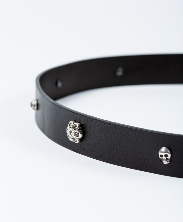 Leather belt with a silver buckle and exclusive details on the loop. The strap is decorated with varied silver pieces and rhinestones, giving it a modern and sophisticated style. The perfect accessory to stand out with elegance on any occasion.