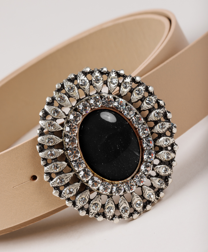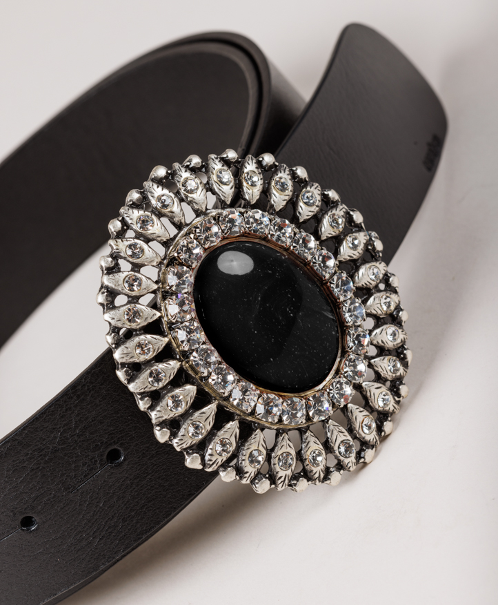 Ceinture pour femme avec une boucle en pierre noir en cuir de première qualité avec une boucle bijou spectaculaire en argent vieilli avec une pierre centrale noir et entouré de cristaux de haute qualité. Super combinables avec tous vos looks