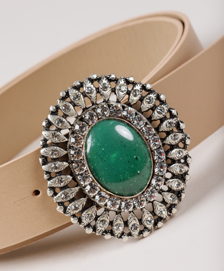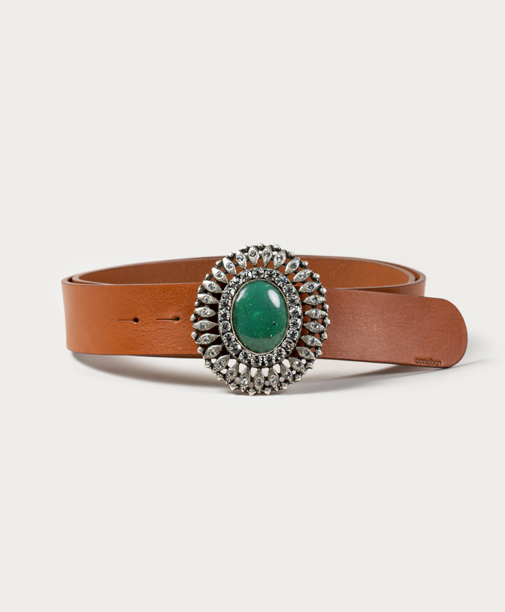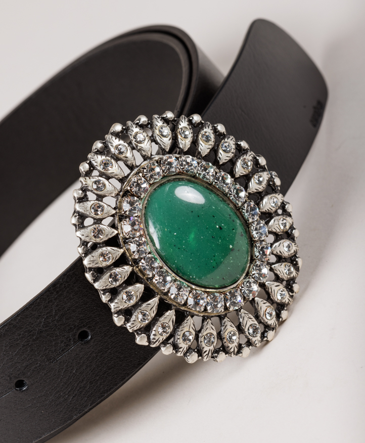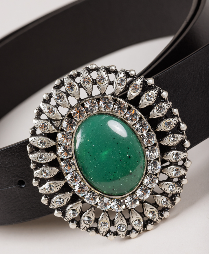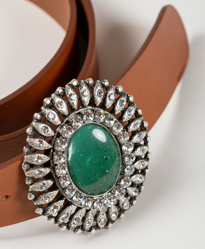 Ceinture pour femme avec une boucle en pierre verte en cuir de première qualité avec une boucle bijou spectaculaire en argent vieilli et cristaux avec une pierre centrale verte ovale.