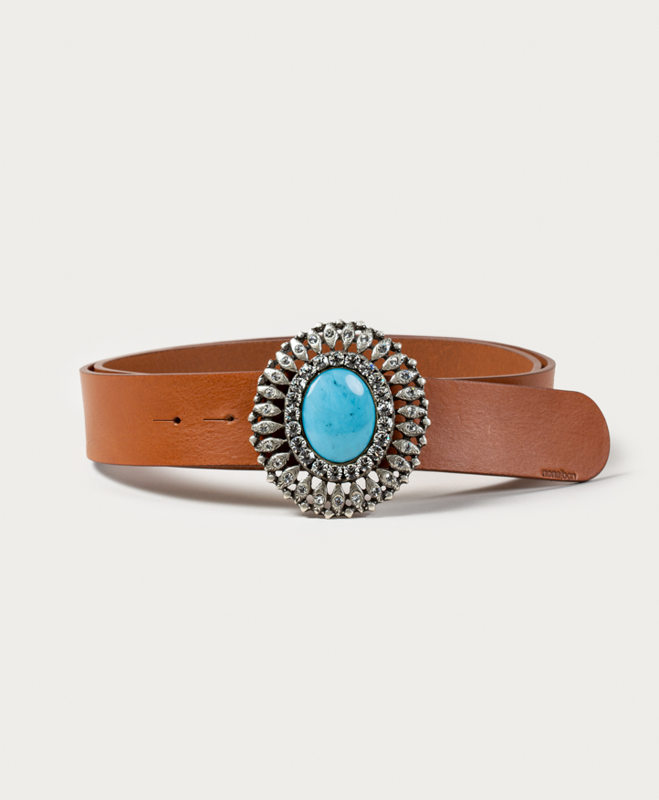 Ceinture pour femme avec une boucle en pierre turquoise en cuir de première qualité avec une boucle bijou spectaculaire en argent vieilli avec une pierre centrale turquoise ovale, d’un bleu opaque, lumineux et intense semblable à celui de la mer et entouré de cristaux de haute qualité. Les turquoises sont puissamment magnétiques et super combinables avec tous vos looks.