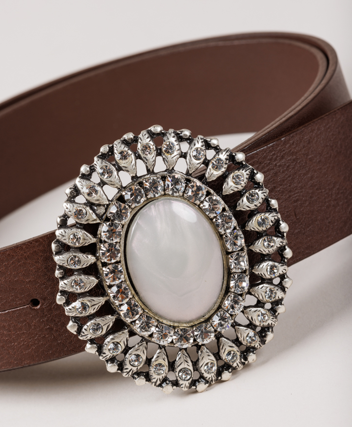 Ceinture pour femme en cuir de première qualité avec une boucle bijou spectaculaire en argent vieilli avec une perle ovale centrale. De par son élégance naturelle et sa neutralité, la perle s’associera à toutes vos tenues, leur apportant un plus de finesse et de brillance.