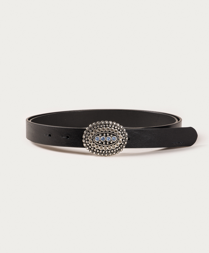 Ceinture Lola Blue. Boucle argentée entourée de cristaux fumés et quatre bleus au centre.