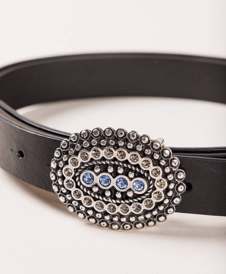 Ceinture pour femme élégante en cuir de première qualité avec une belle boucle argentée de forme ovale entourée de cristaux de couleur fumée et de 4 diamants bleus au centre.. Une boucle qui donnera une touche de lumière à tous vos looks. Combinez-le avec tout ! La ceinture Lola est un accessoire idéal à porter avec n’importe quel vêtement. Sa largeur du cuir de 2,5 cm vous permettra de le porter facilement avec n’importe quel pantalon et d’être toujours parfait.