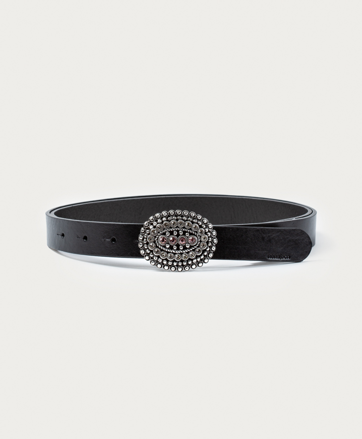 Ceinture Lola Rose. Boucle ovale entourée de cristaux fumés et de quatre cristaux roses au centre.