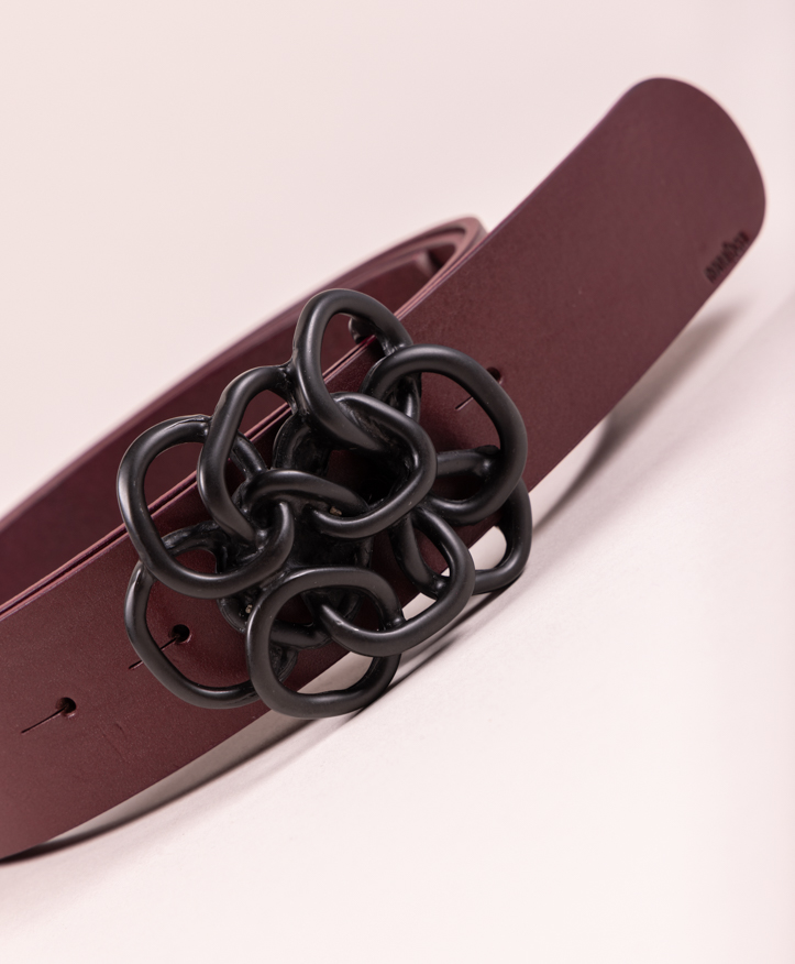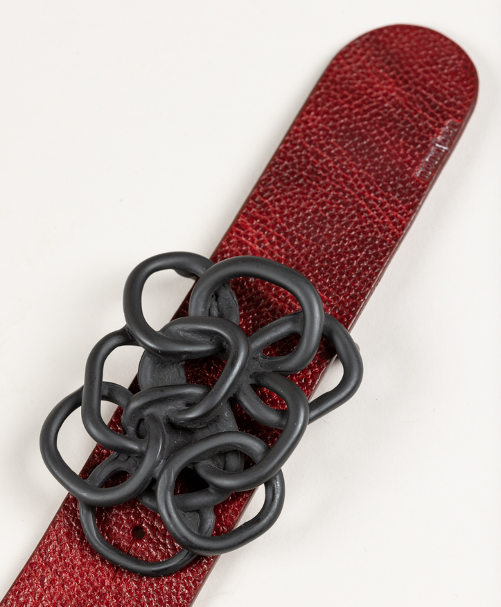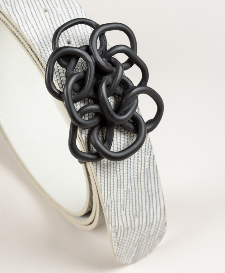 Ceinture luxueuse en cuir de première qualité avec une boucle bijou noire spectaculaire en forme de nœud entrelacé.