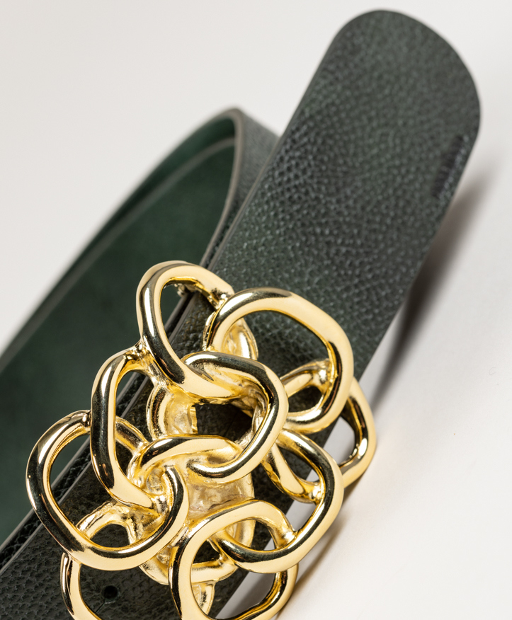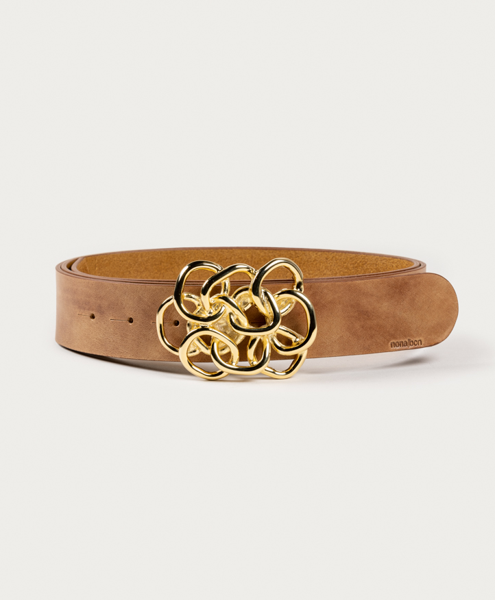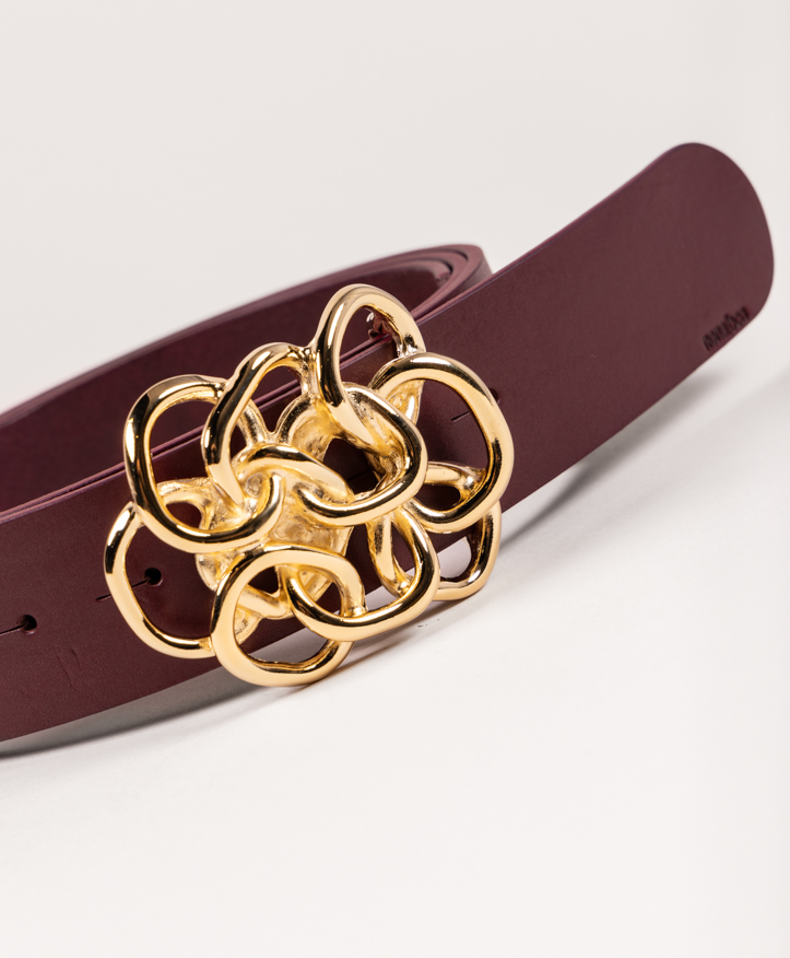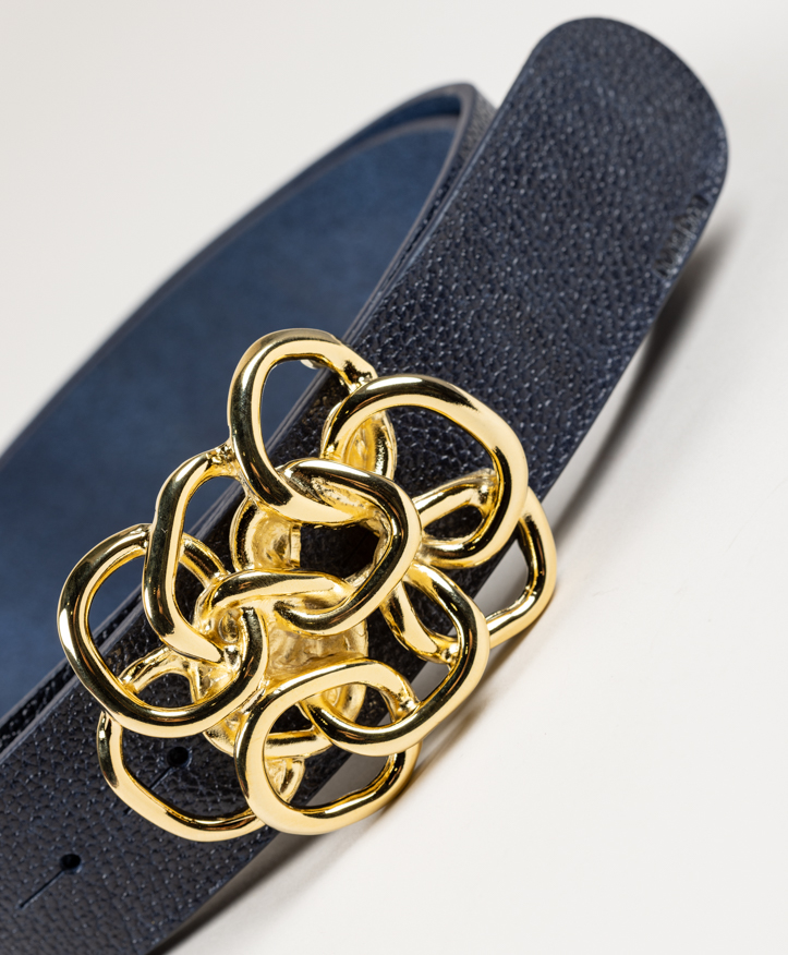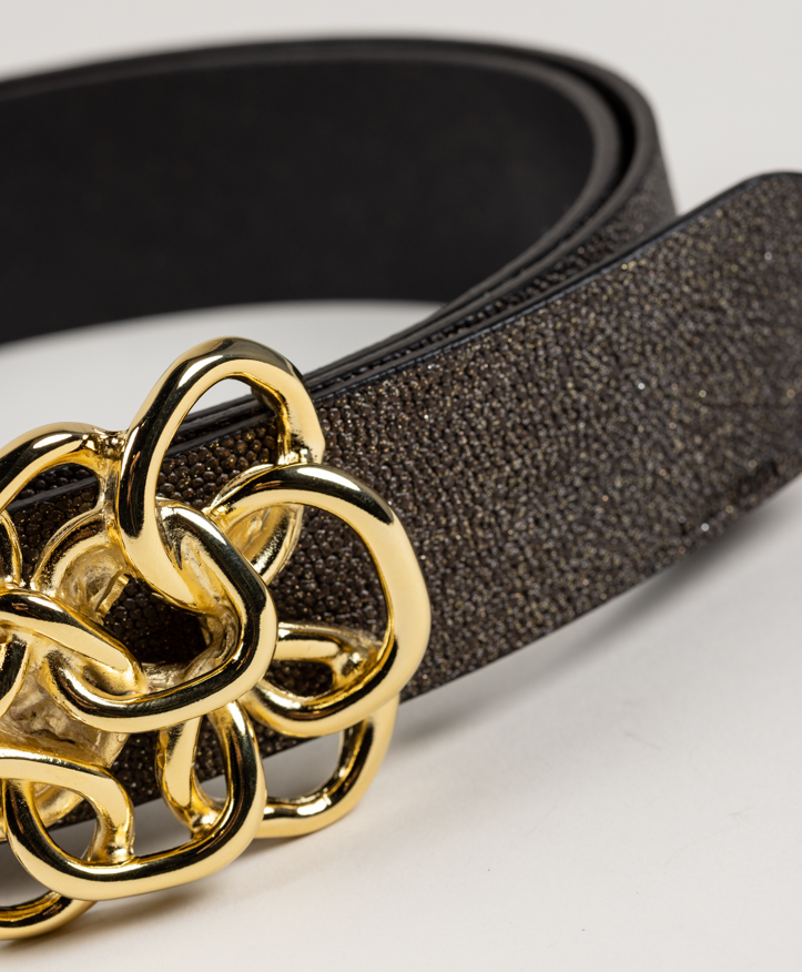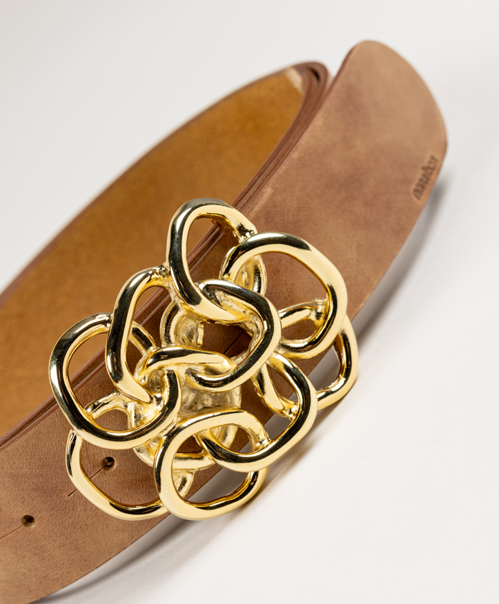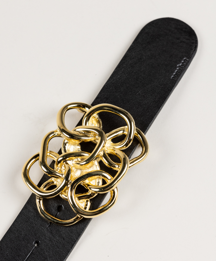 Ceinture luxueuse en cuir de première qualité avec une boucle bijou dorée spectaculaire en forme de nœud entrelacé.