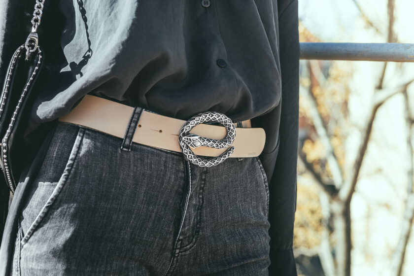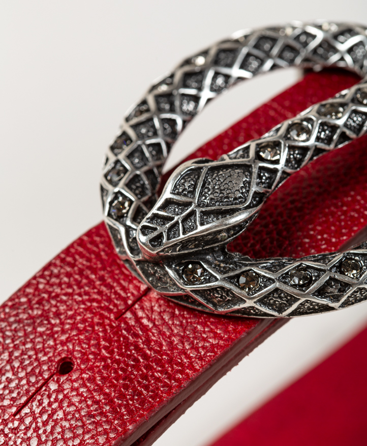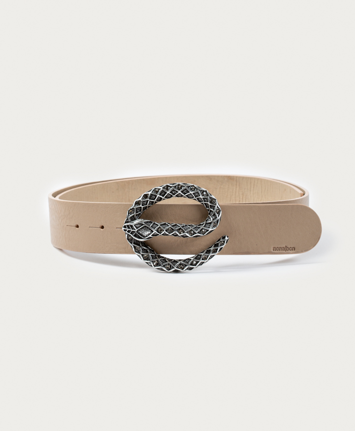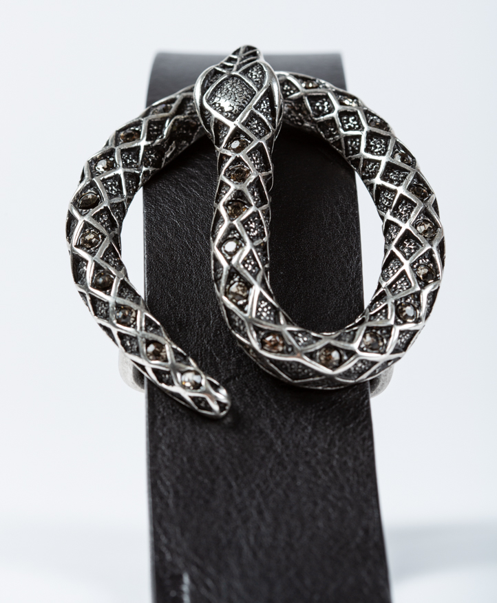 Ceinture en cuir de première qualité avec une spectaculaire boucle en forme de serpent et de petits cristaux fumés.
