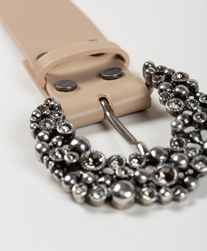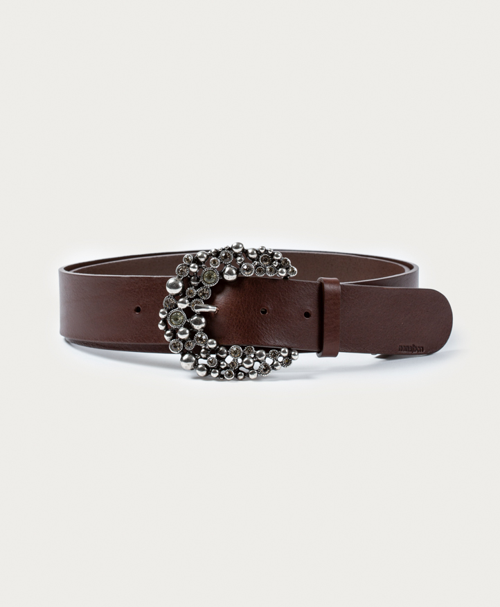 Ceinture en cuir de haute qualité avec une boucle bijou spectaculaire, demi-lune argentée et décorée d’une variété de cristaux.