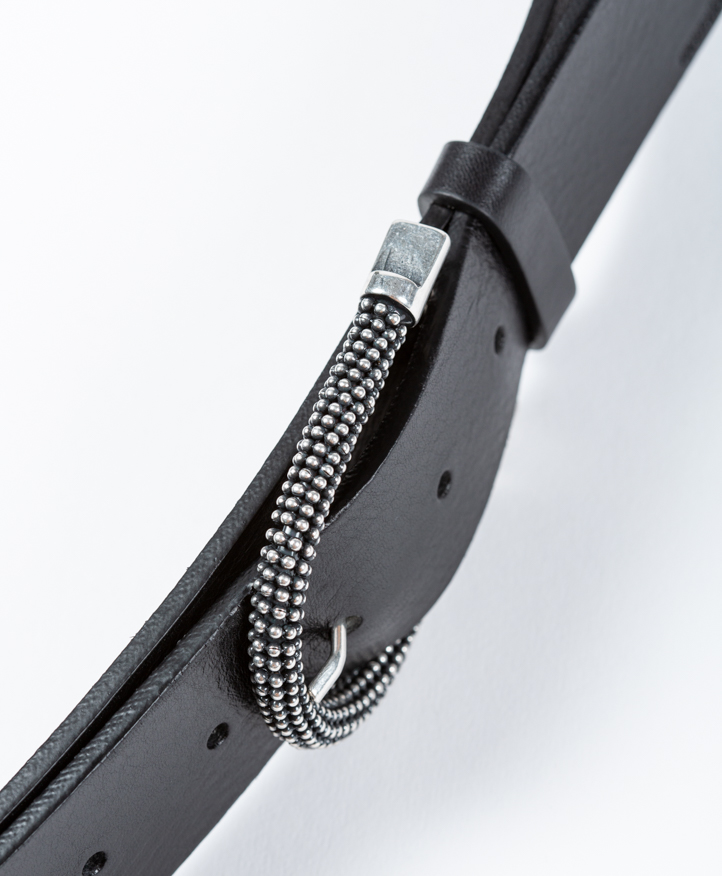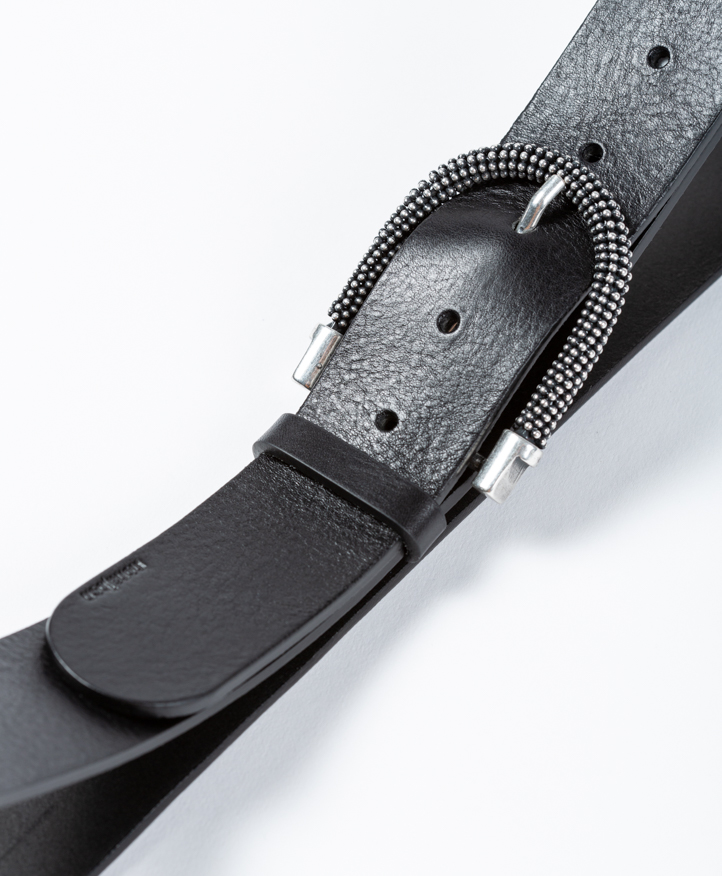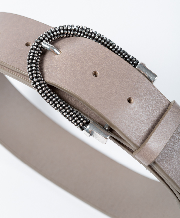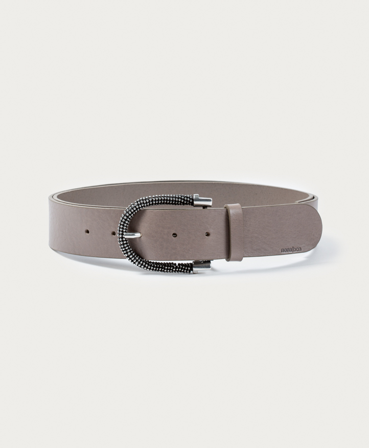 Ceinture en cuir de première qualité avec une boucle demi-lune bijou précieuse de couleur argent.
