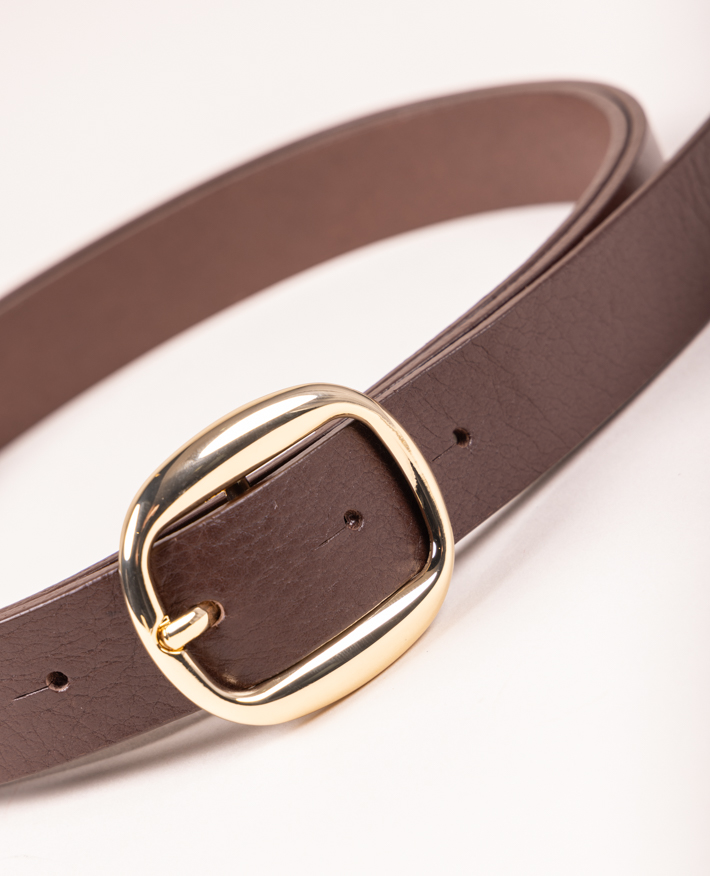 Elegante cinturón de mujer fabricado en piel de primera calidad con hebilla dorada con diseño ovalado. ¡Combínala con todo! El cinturón Thelma es un accesorio ideal para lucir con cualquier prenda. Su ancho de correa de 2,5 cm te facilitará poderlo llevar con cualquier pantalón o vestida y lucir perfecta siempre.