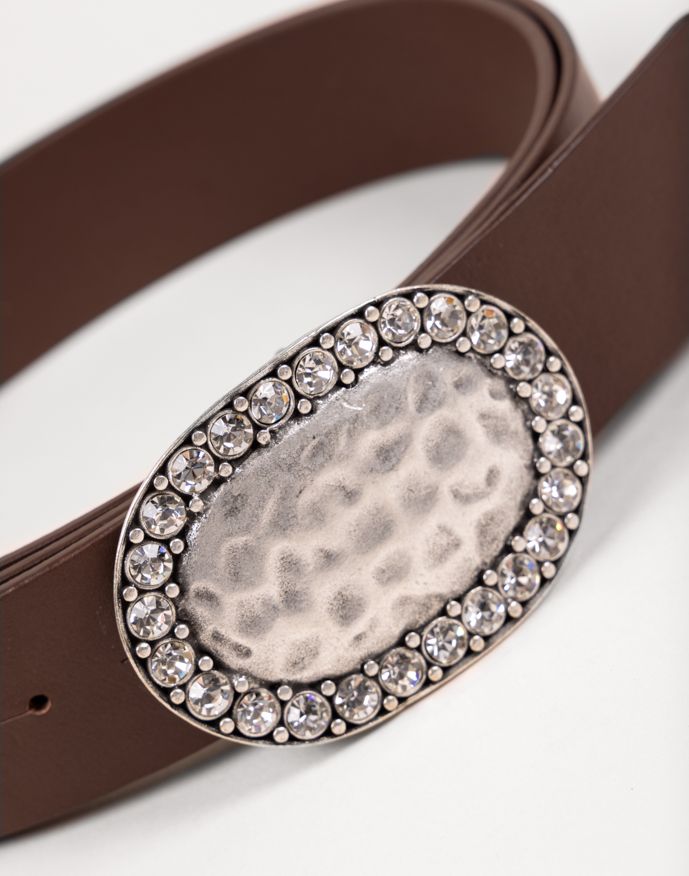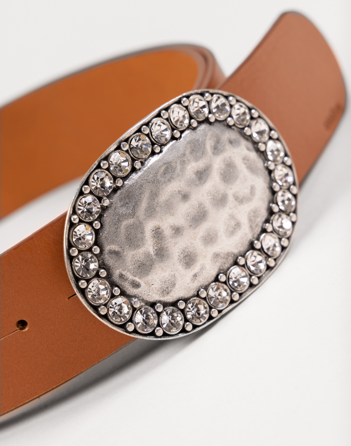 Cinturón confeccionado en piel de alta calidad, diseñado para aportar un toque sofisticado a cualquier look. Su hebilla joya plateada de forma ovalada destaca por estar delicadamente rodeada de cristales, creando un acabado brillante y refinado. Ideal para realzar tanto estilismos casuales como outfits más elegantes, combinando funcionalidad y estilo en una sola pieza.