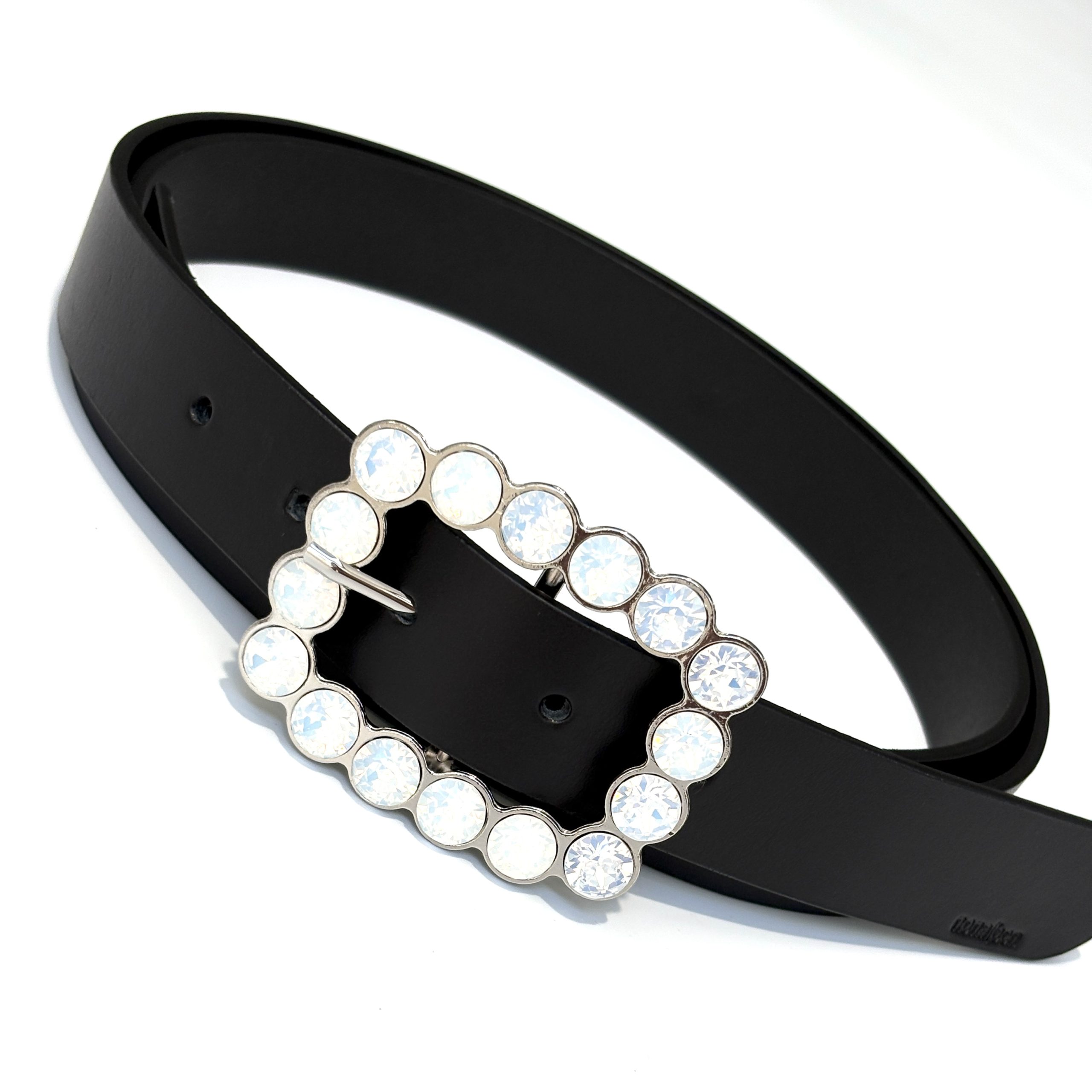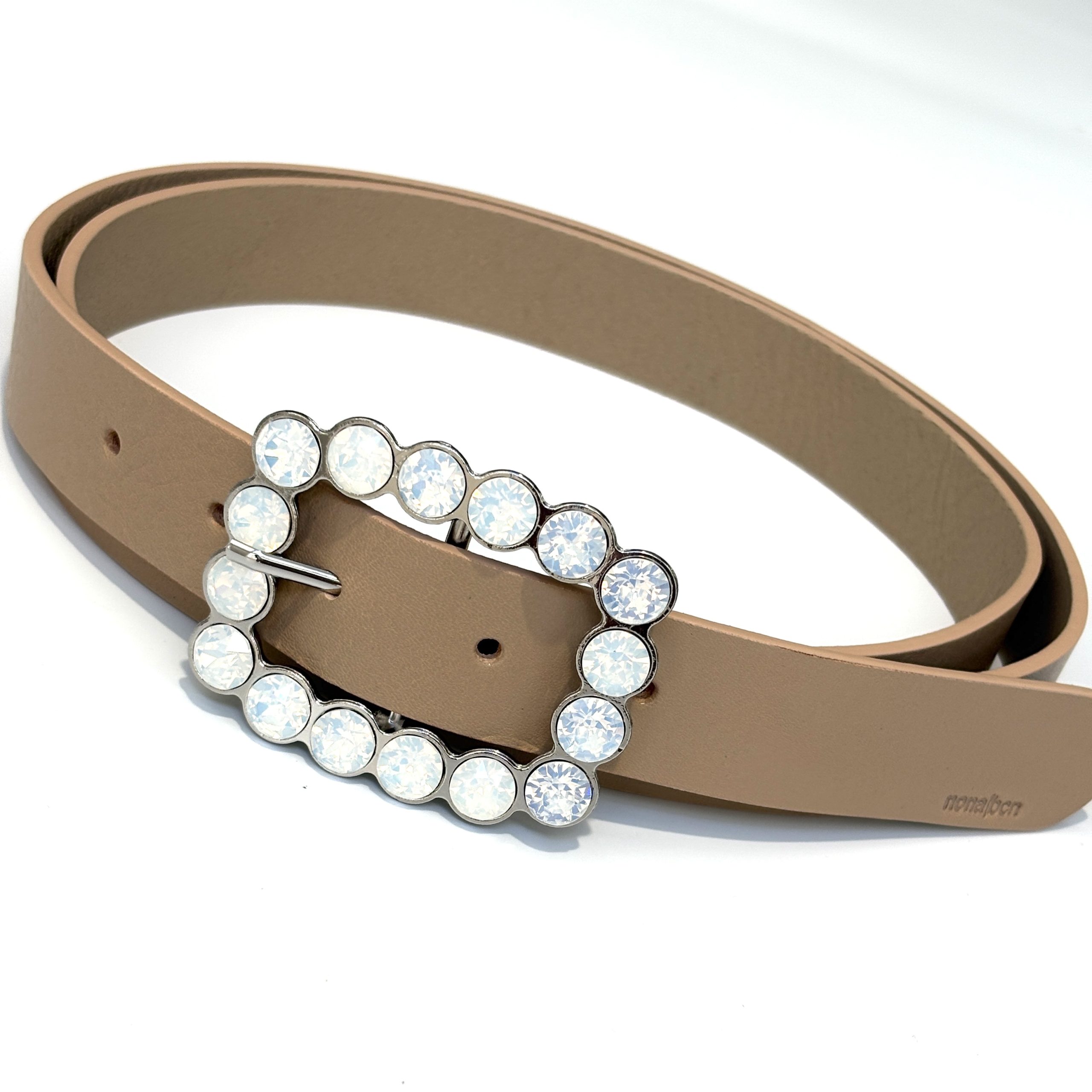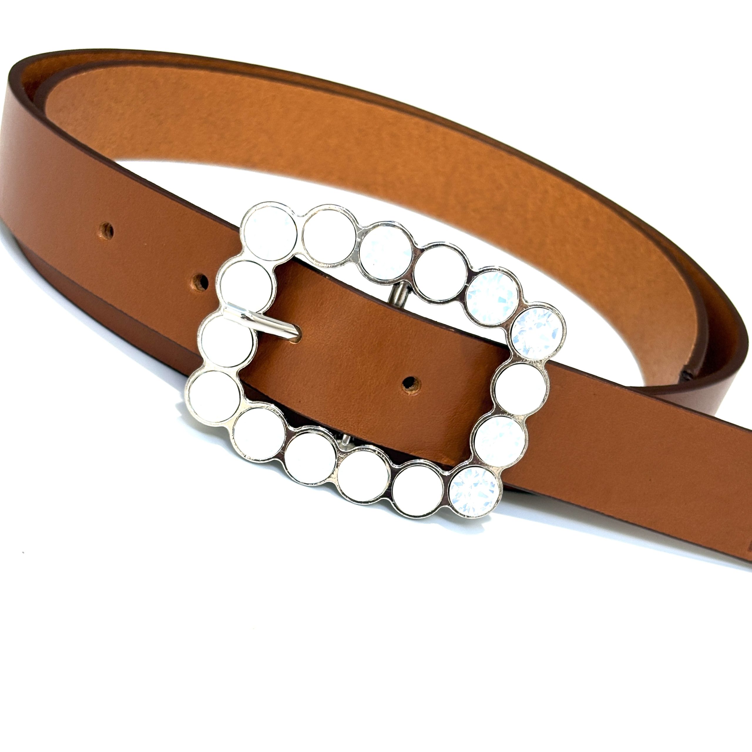 Elegante cinturón de mujer fabricado en piel de primera calidad con pequeña hebilla joya con cristales color blanco. Una hebilla que dará un toque de luz a todos tus looks. ¡Combínala con todo! El accesorio ideal para lucir con cualquier prenda. Su ancho de correa de 3 cm te facilitará poderlo llevar con cualquier pantalón y lucir perfecta siempre.