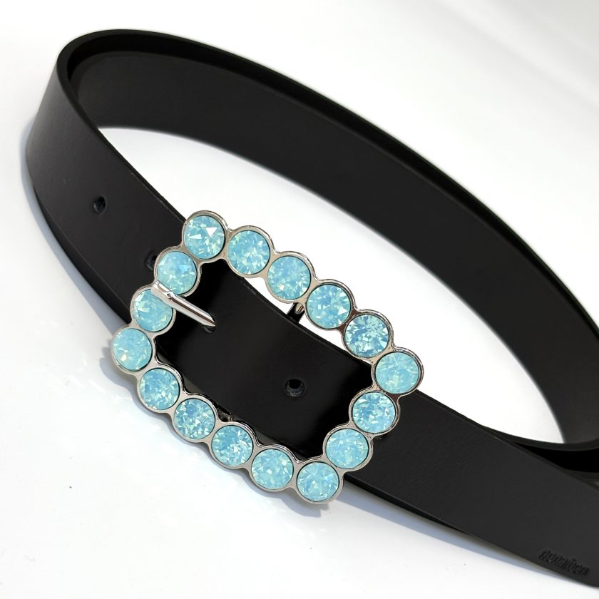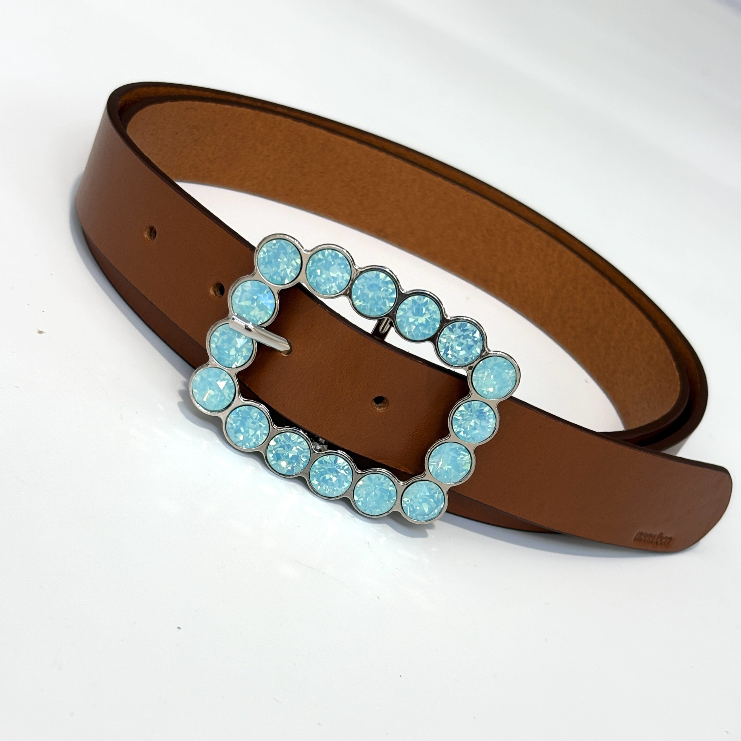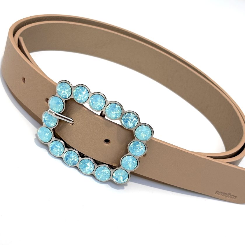 Elegante cinturón de mujer fabricado en piel de primera calidad con pequeña hebilla joya con cristales color turquesa. Una hebilla que dará un toque de luz a todos tus looks. ¡Combínala con todo! El accesorio ideal para lucir con cualquier prenda. Su ancho de correa de 3 cm te facilitará poderlo llevar con cualquier pantalón y lucir perfecta siempre.