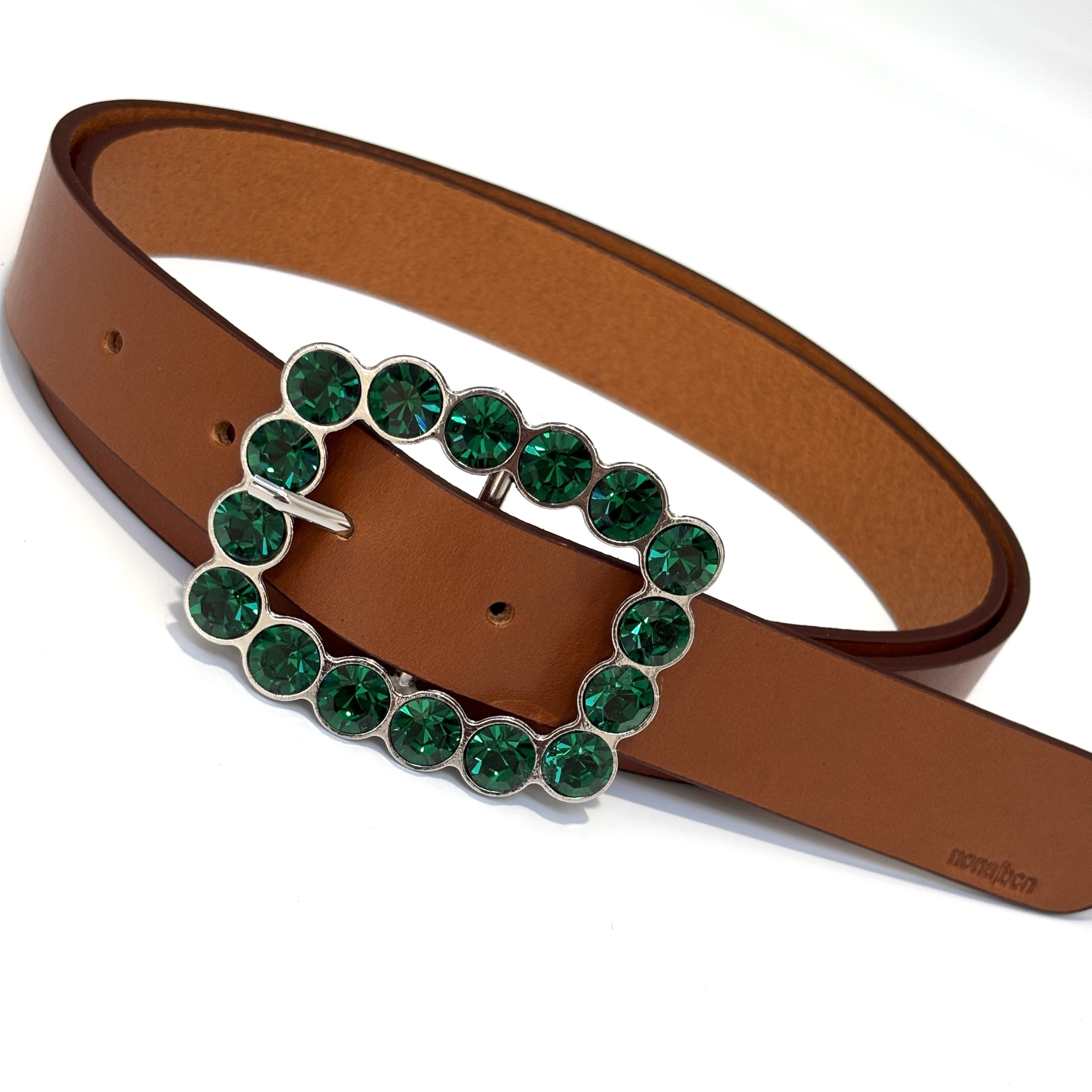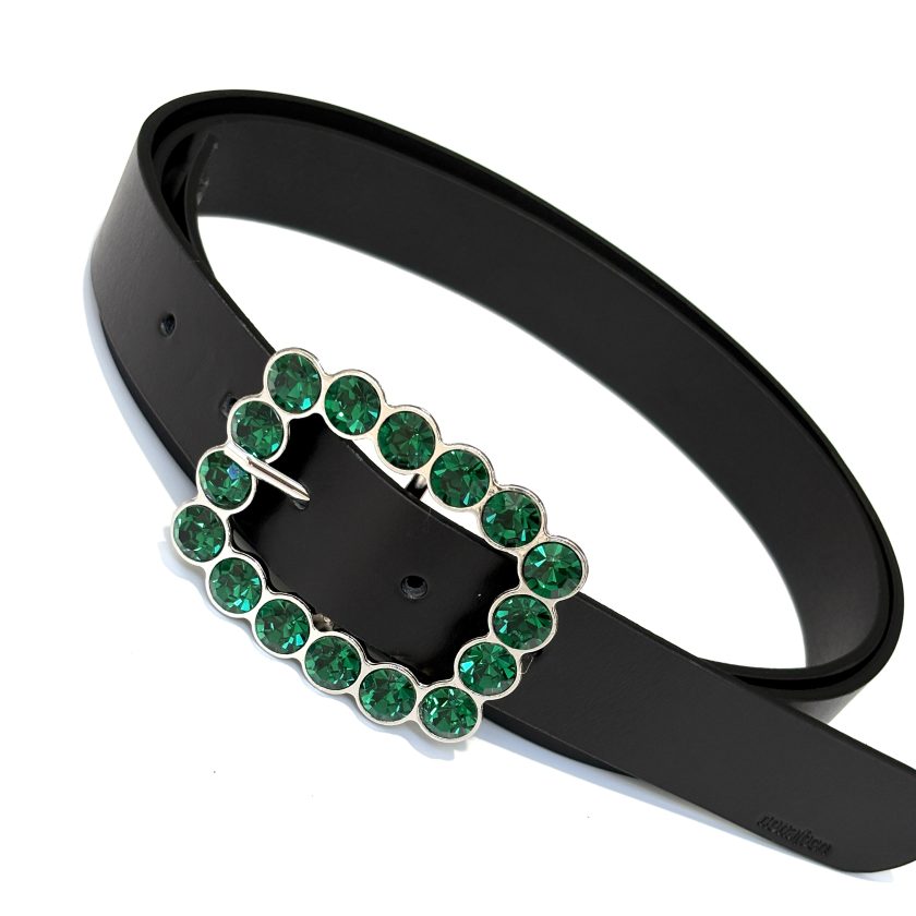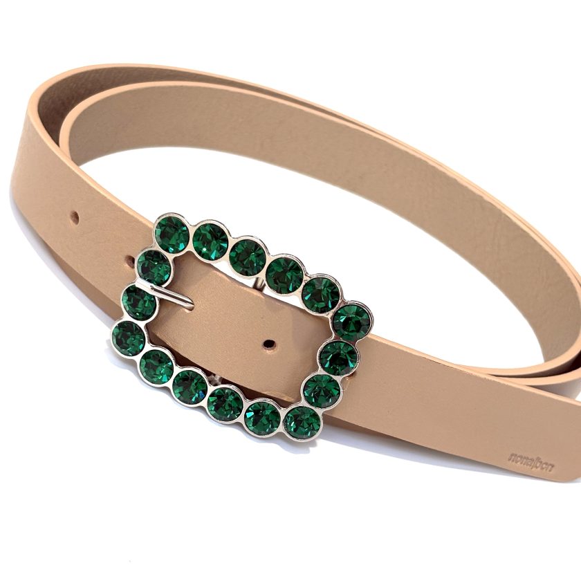 Elegante cinturón de mujer fabricado en piel de primera calidad con pequeña hebilla joya con cristales color verde. Una hebilla que dará un toque de luz a todos tus looks. ¡Combínala con todo! El accesorio ideal para lucir con cualquier prenda. Su ancho de correa de 3 cm te facilitará poderlo llevar con cualquier pantalón y lucir perfecta siempre.