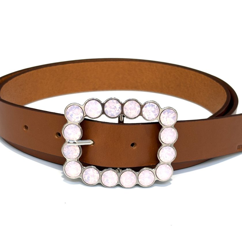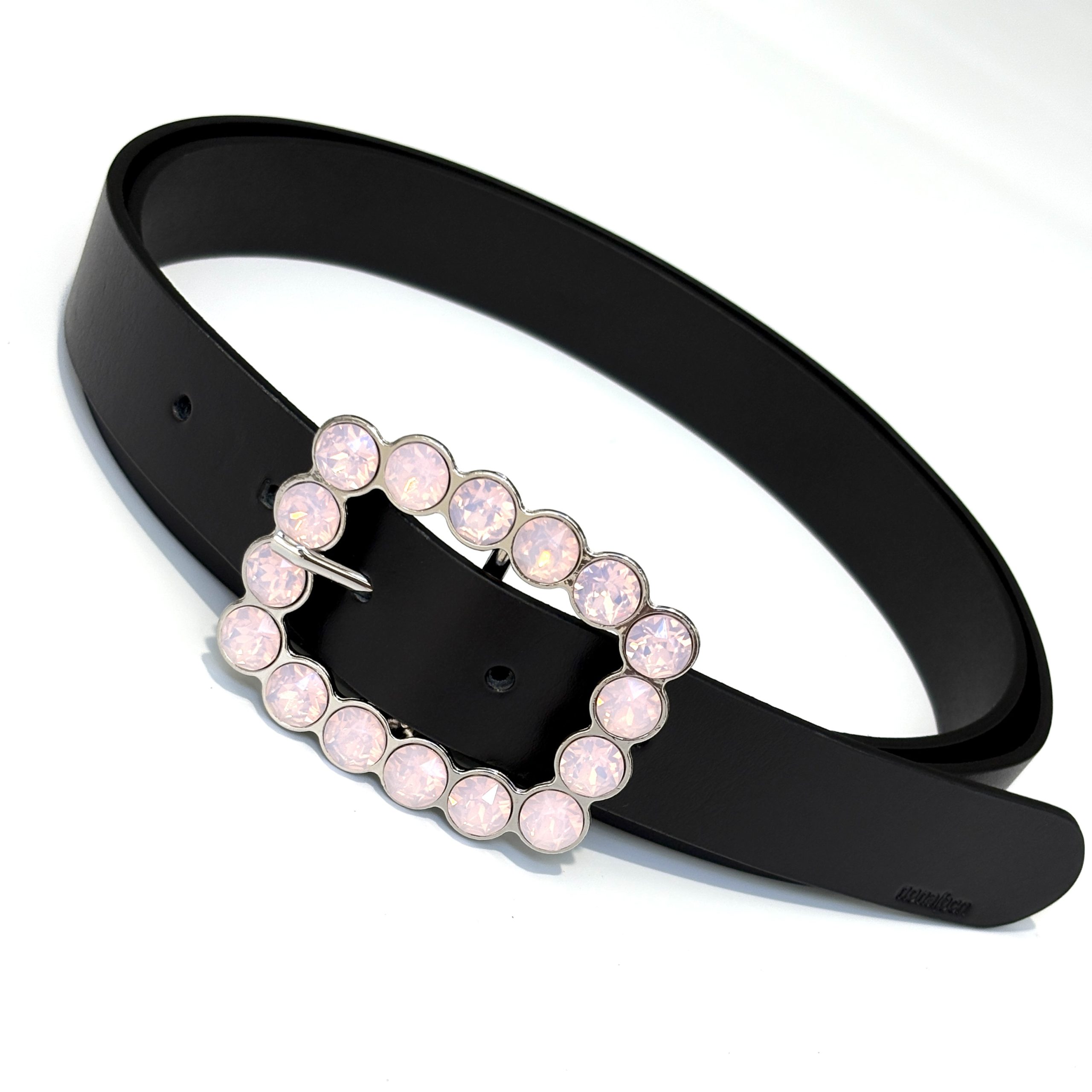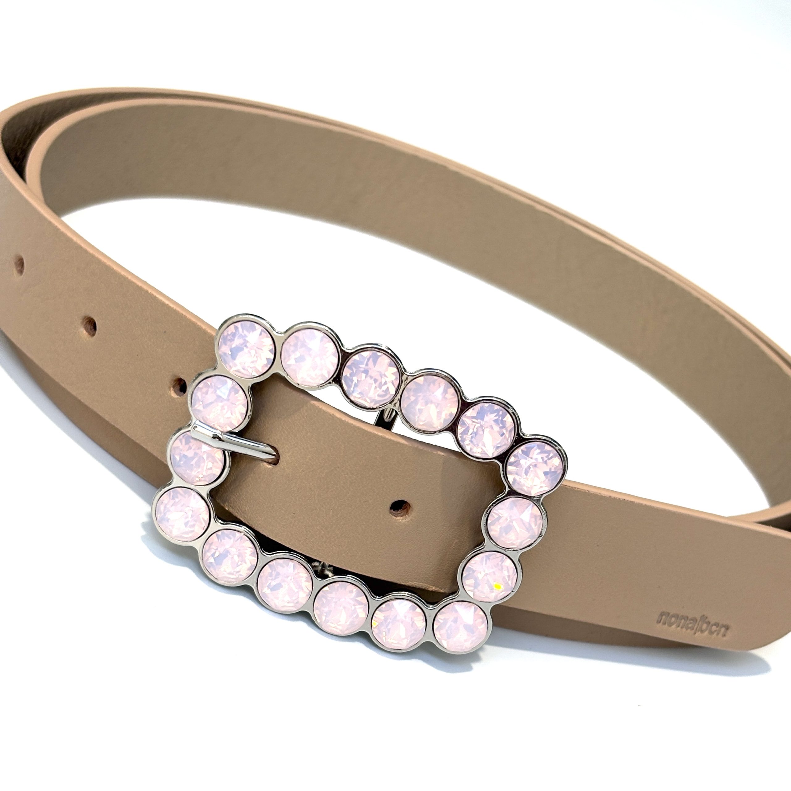 Elegante cinturón de mujer fabricado en piel de primera calidad con pequeña hebilla joya con cristales color rosa. Una hebilla que dará un toque de luz a todos tus looks. ¡Combínala con todo! El accesorio ideal para lucir con cualquier prenda. Su ancho de correa de 3 cm te facilitará poderlo llevar con cualquier pantalón y lucir perfecta siempre.